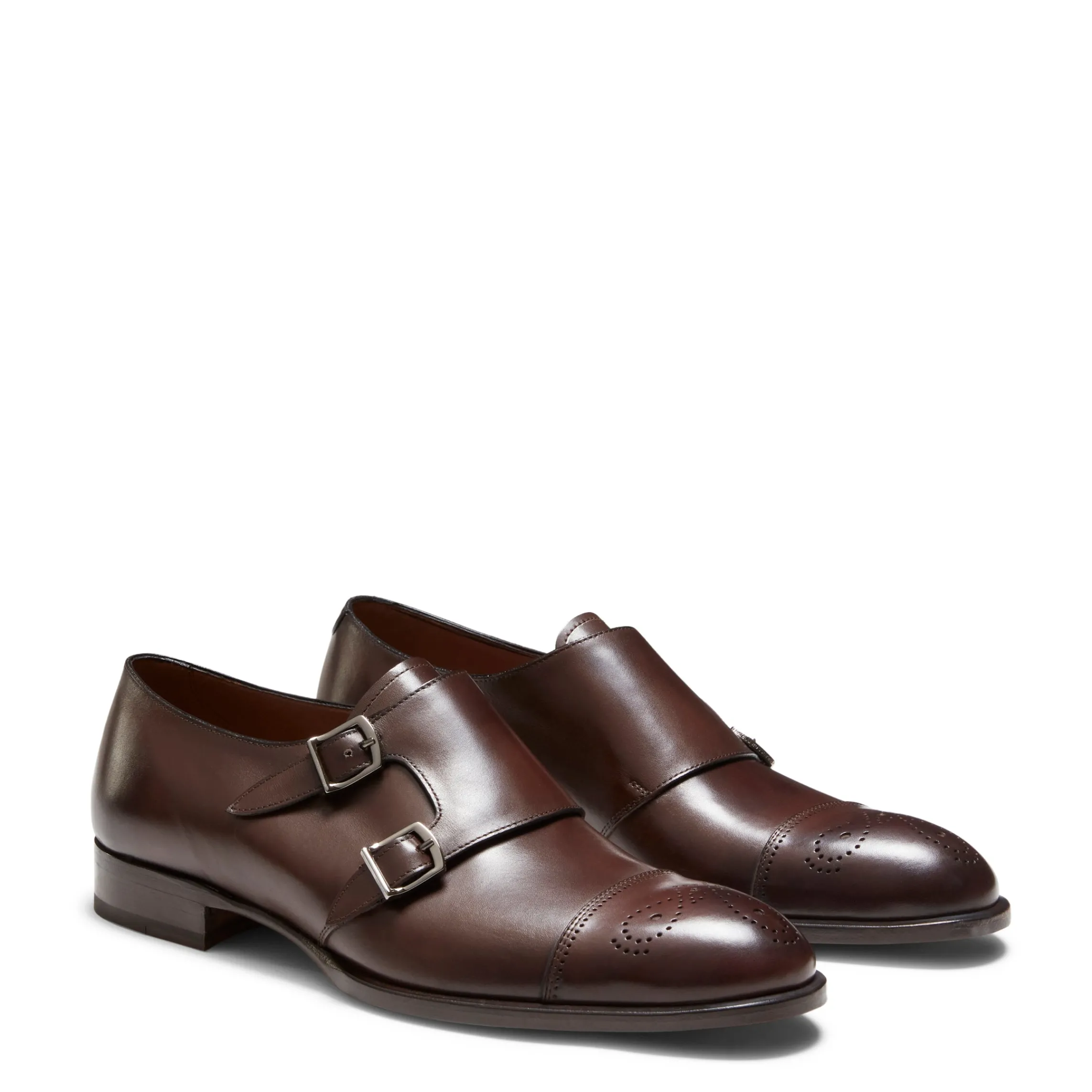 Double-buckle derby shoe made of soft smooth leather with perforations on the toe. The unique workmanship gives the shoe a gradient appearance, accentuated in particular on the toe and spur. Leather sole.