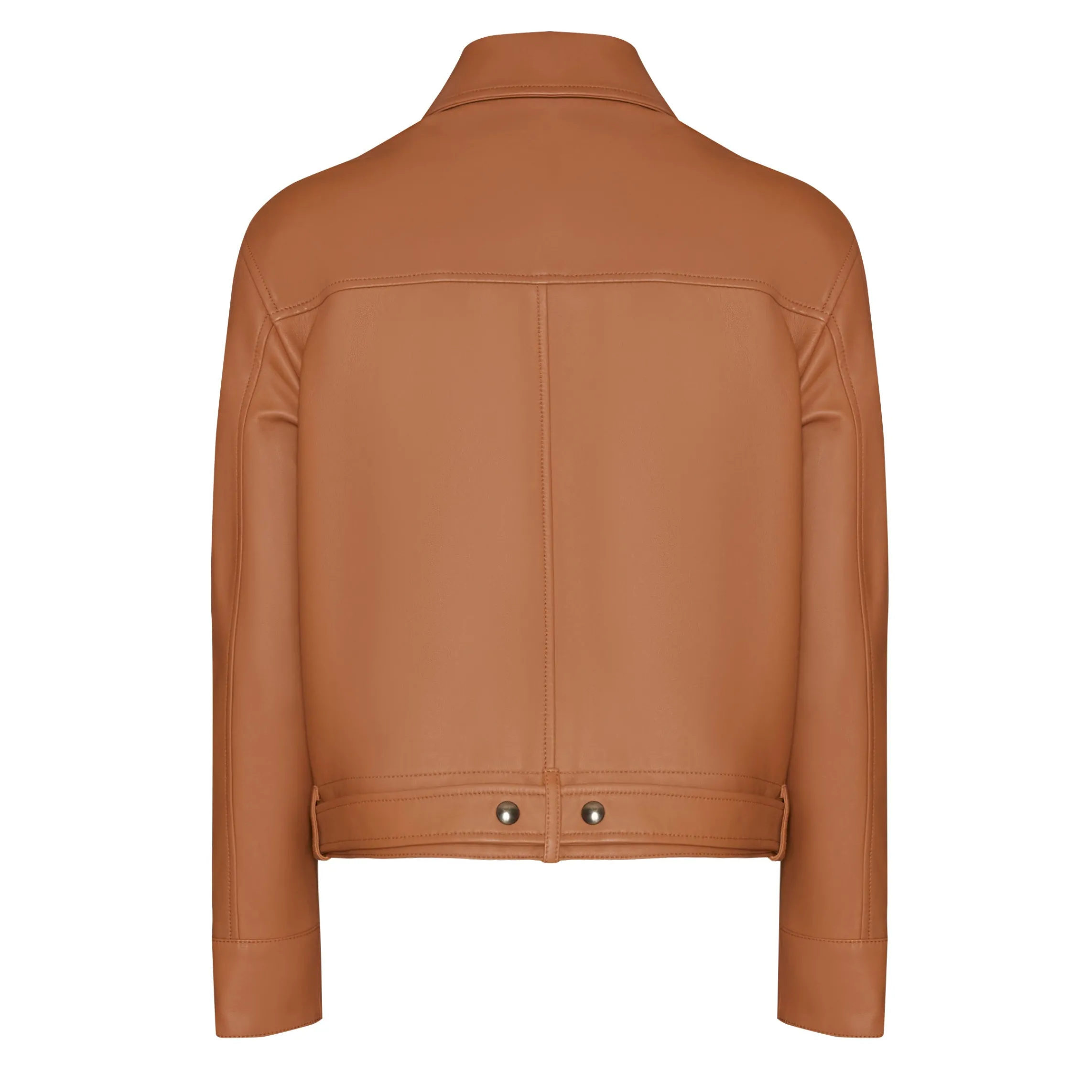 Straight-cut equestrian-style jacket made of nappa leather. Lapel collar, zip pockets and sleeves with dropped shoulders and cuffs. Central zip closure. Unique belt on the bottom that lends a refined detail. Lined in a contrasting colour.
